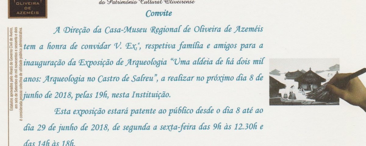 A Casa-Museu Regional de Oliveira de Azeméis informa que irá inaugurar a Exposição de Arqueologia "Uma aldeia de há dois mil anos: Arqueologia no Castro de Salreu" no próximo dia 8 de junho de 2018, pelas 19h, nas nossas instalações.