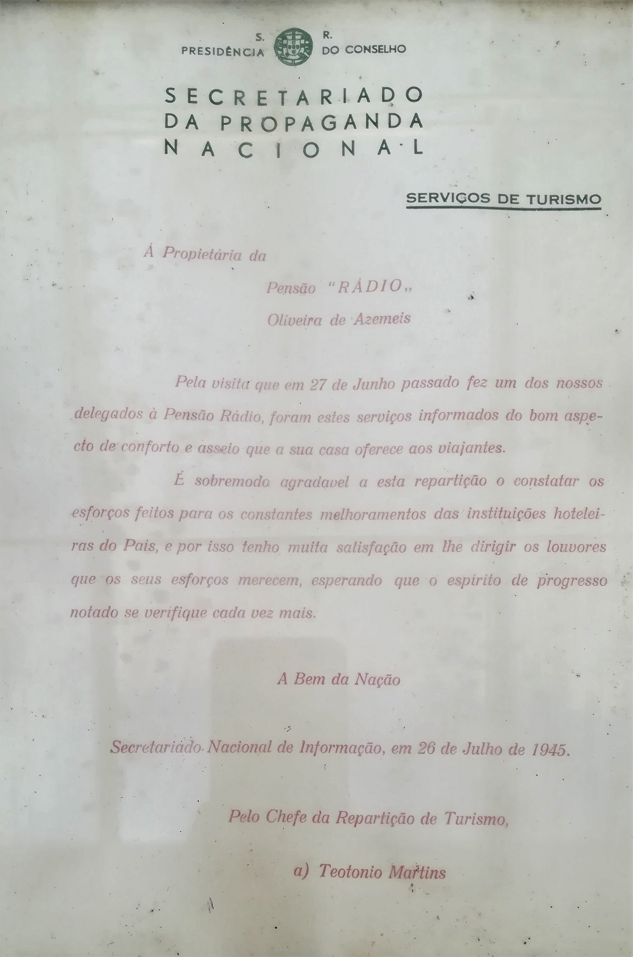 Aqui pode ver o certificado de fiscalização da Pensão “Rádio” que existia em Oliveira de Azeméis, passado pelo Secretariado da Propaganda Nacional, em 1945. Este documento foi doado por Maria de Fátima Azevedo Teixeira Lopes da Silva.