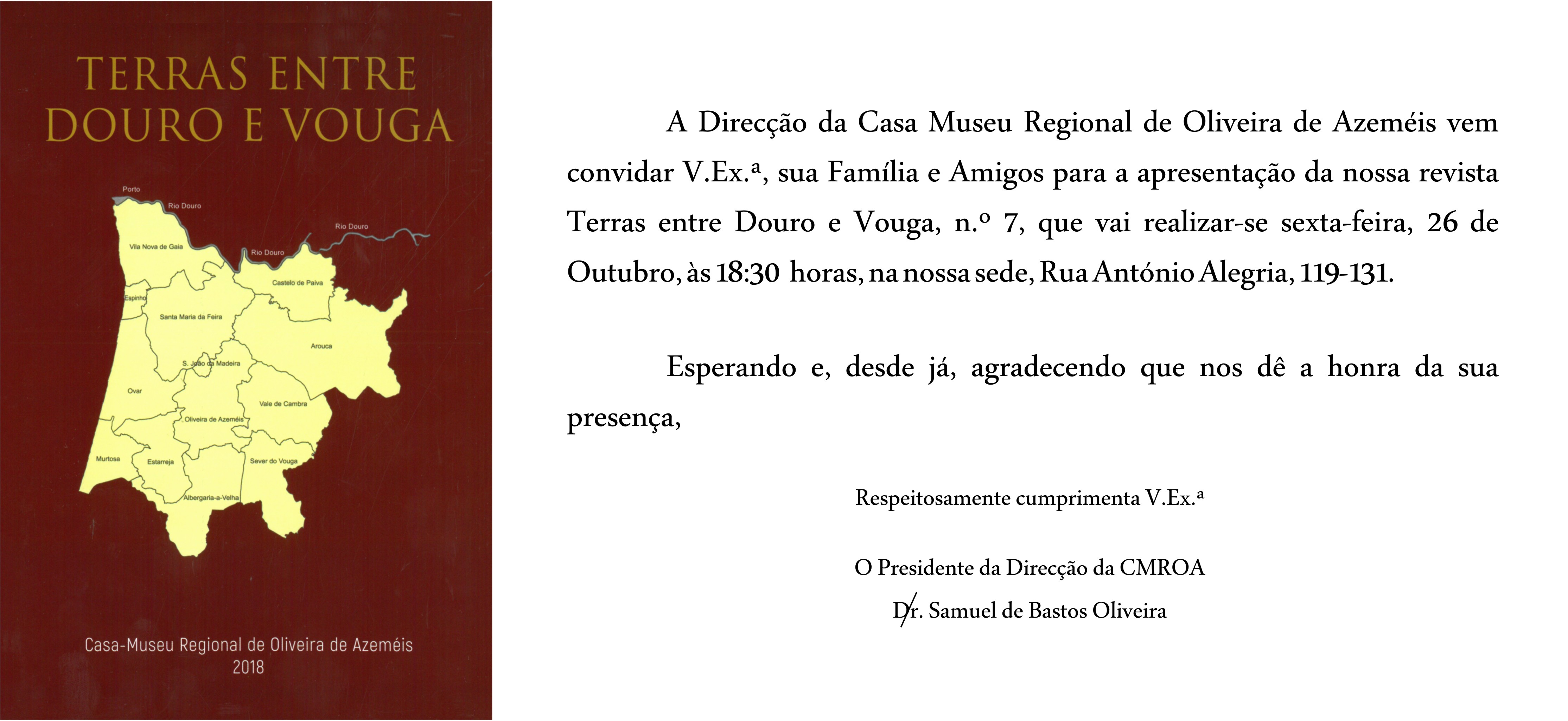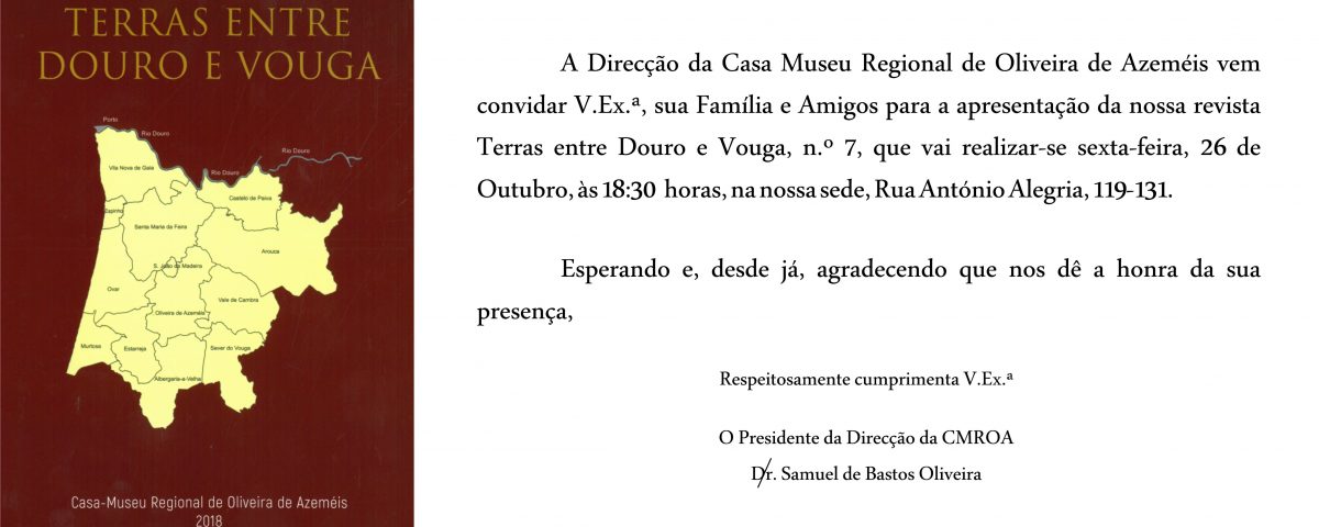 Outubro 19, 2018Apresentação/Lançamento de livro, outubro de 2018Casa Museu Regional Apresentação e lançamento da revista “Terras entre Douro e Vouga”, nº7Apresentação e Lançamento da revista "Terras entre Douro e Vouga", nº7 - Dia 26 de Outubro de 2018 - 18.30h - Na Casa-Museu Regional de Oliveira de Azeméis