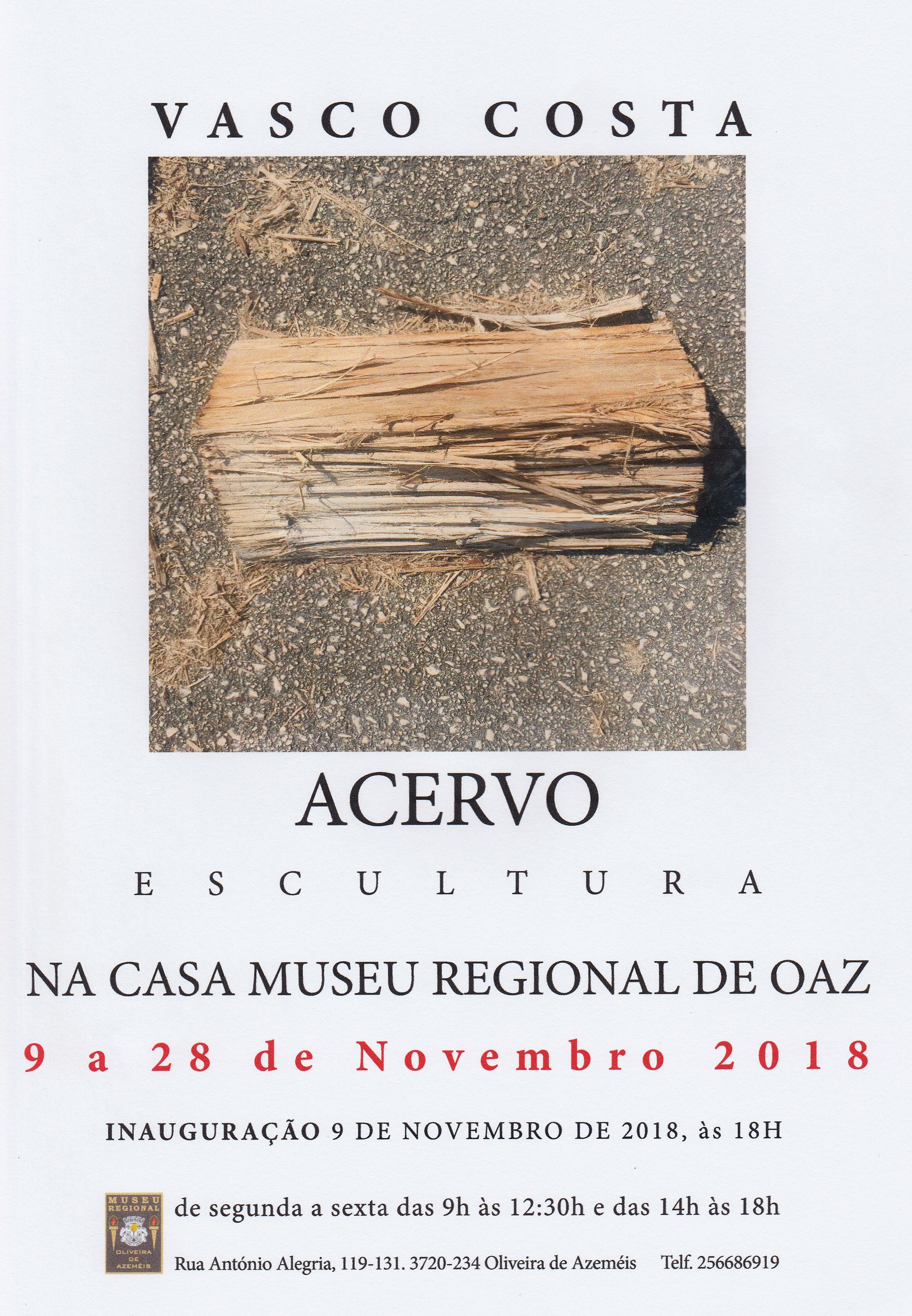 Novembro 8, 20182018, Exposições temporárias, novembro de 2018Casa Museu Regional Exposição de Escultura “Acervo” de Vasco Costa Inauguração da Exposição de Escultura "Acervo" de Vasco Costa, no dia 9 de novembro de 2018, às 18h, na Casa-Museu Regional de Oliveira de Azeméis.
