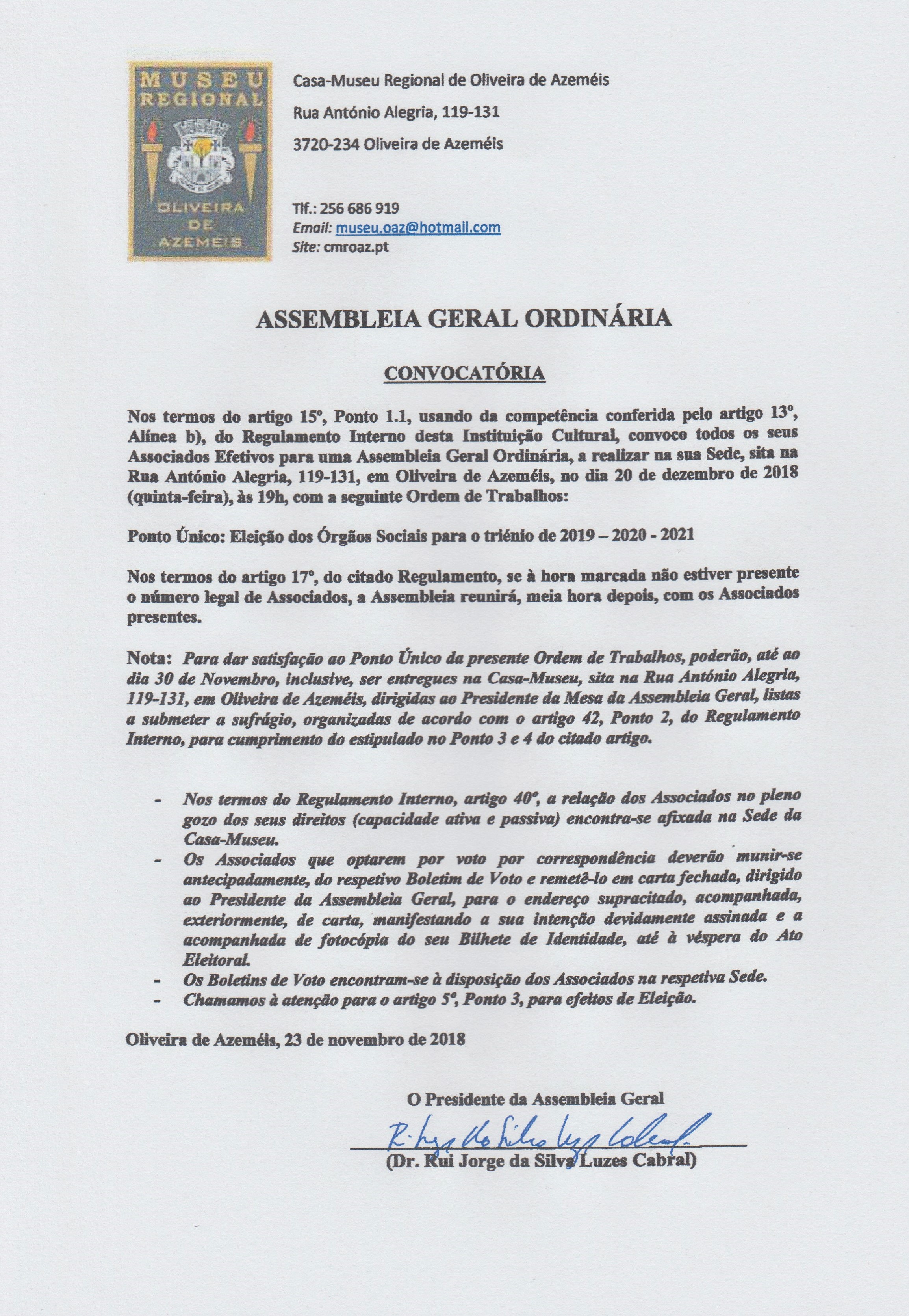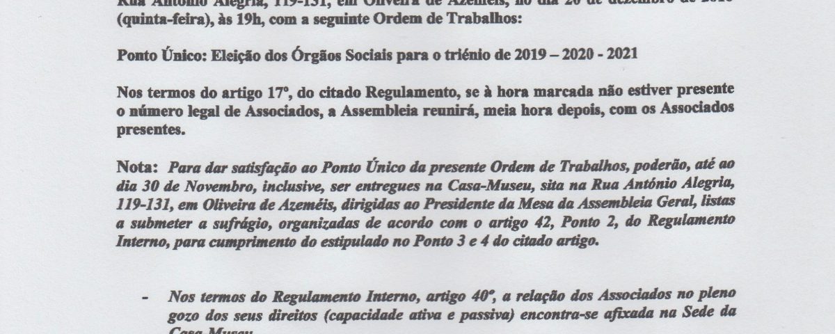 A Casa-Museu Regional de Oliveira de Azeméis informa que se vai realizar no próximo dia 20 de dezembro de 2018, às 19h, uma Assembleia Geral Ordinária, cujo ponto único será a eleição dos órgãos sociais para o triénio de 2019-2020-2021.