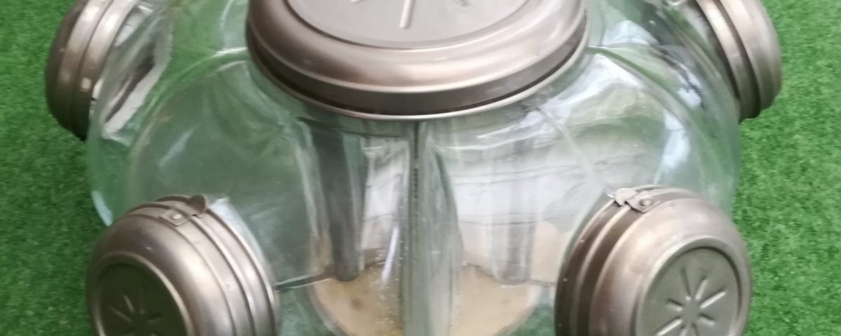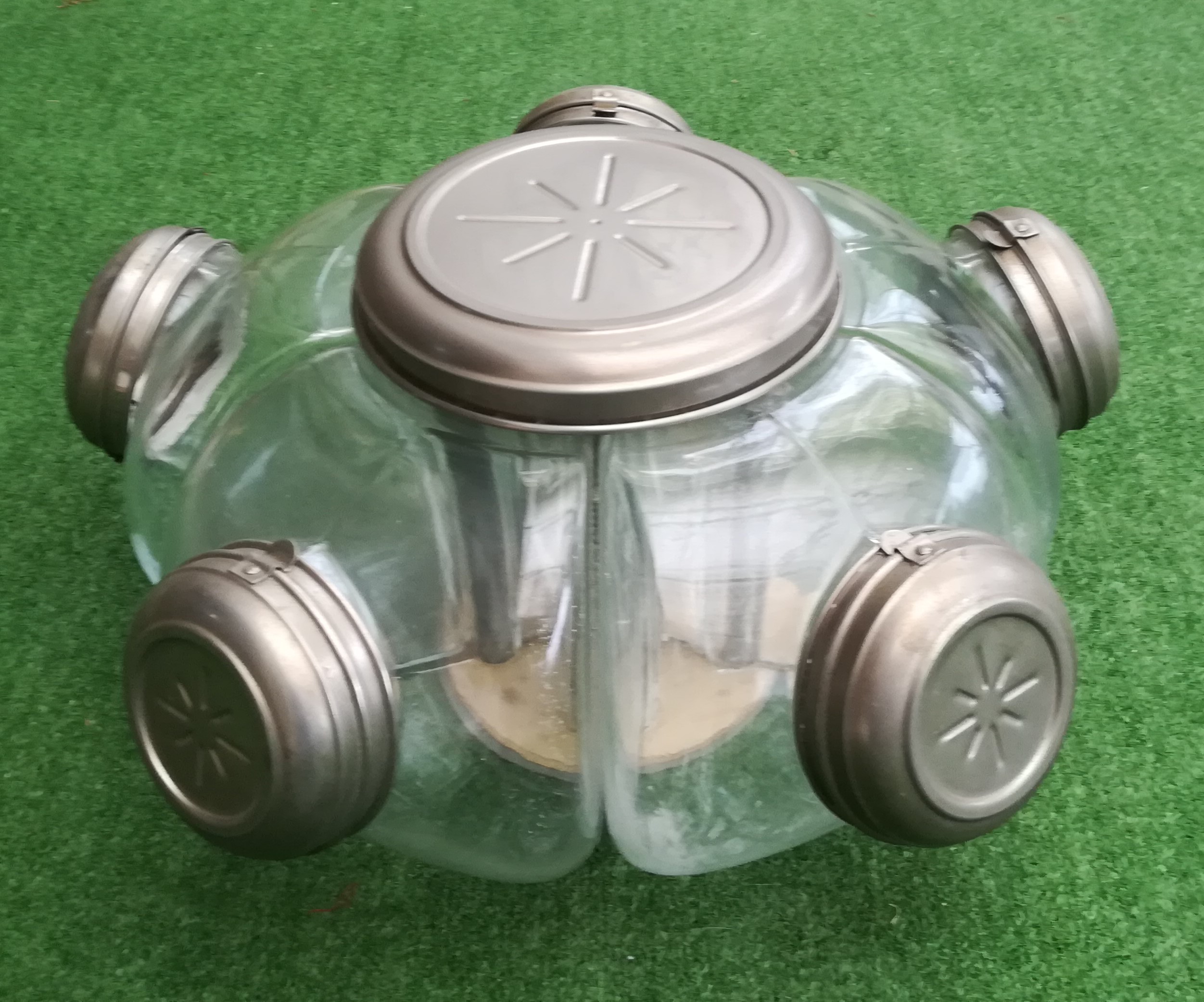 Conjunto de cinco frascos de rebuçados em vidro, cada um com tampa de metal. Possui um suporte de metal, no centro, que permite rodar os frascos, para procurar o produto desejado. Possui na parte de cima uma tampa que esconde o espaço que existe entre os cinco frascos.