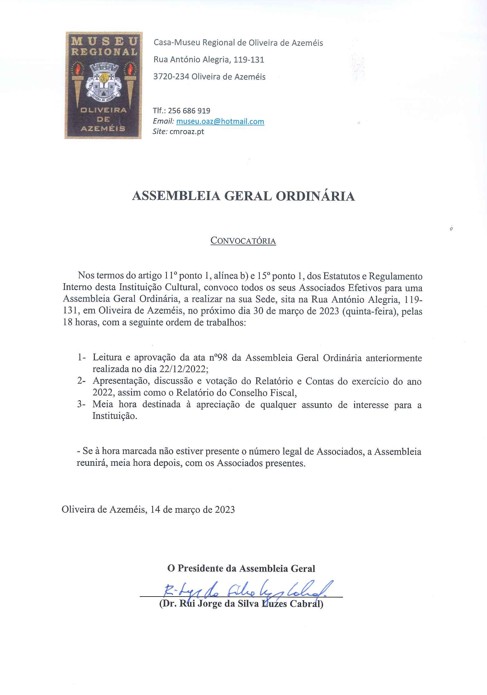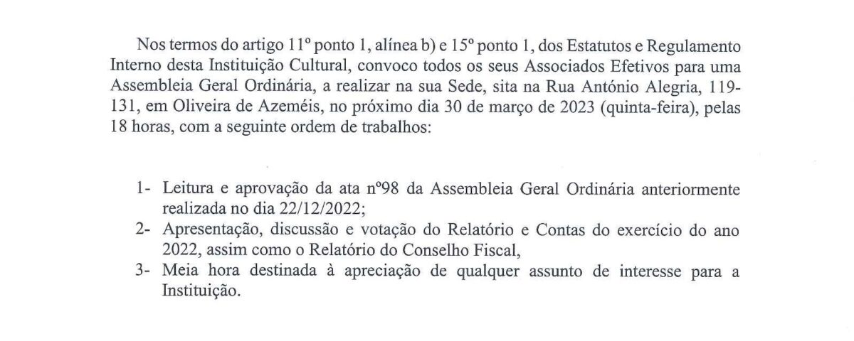 A Direção da Casa-Museu Regional de Oliveira de Azeméis informa que vai realizar-se, nas nossas instalações, no dia 30 de março de 2023, às 18h, uma Assembleia Geral Ordinária, que terá como ponto principal da ordem de trabalhos, a apresentação, discussão e votação do Relatório e Contas do exercício do ano 2022, assim como o Relatório do Conselho Fiscal.