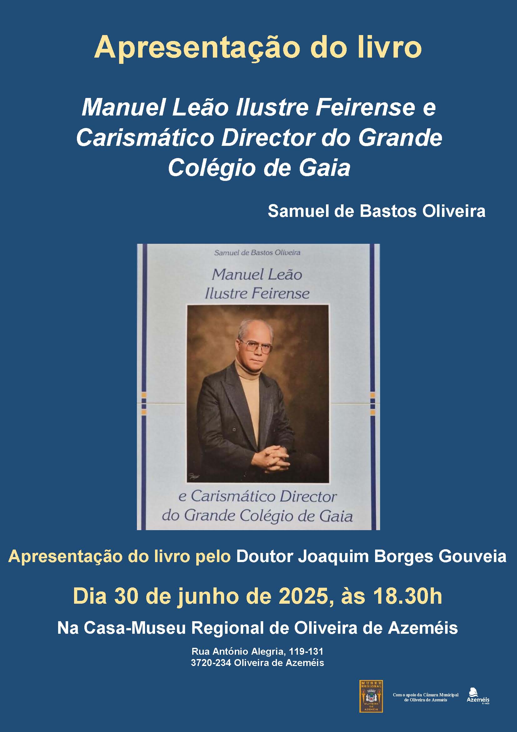 A Casa-Museu Regional de Oliveira de Azeméis informa que vai realizar-se, nas nossas instalações, a apresentação do livro “Manuel Leão Ilustre Feirense e Carismático Director do Grande Colégio de Gaia”, da autoria de Samuel de Bastos Oliveira, no próximo dia 30 de junho de 2025, às 18.30h.