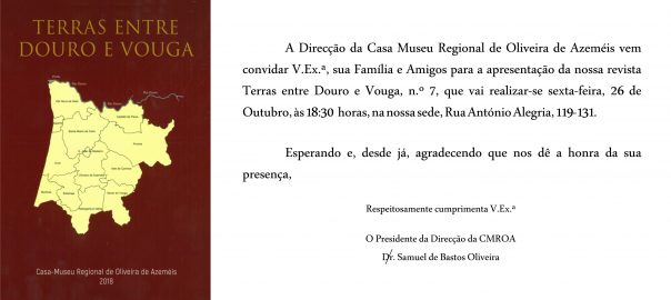 Apresentação e Lançamento da revista “Terras entre Douro e Vouga”, nº7 – Dia 26 de Outubro de 2018 – 18.30h – Na Casa-Museu Regional de Oliveira de Azeméis