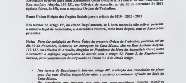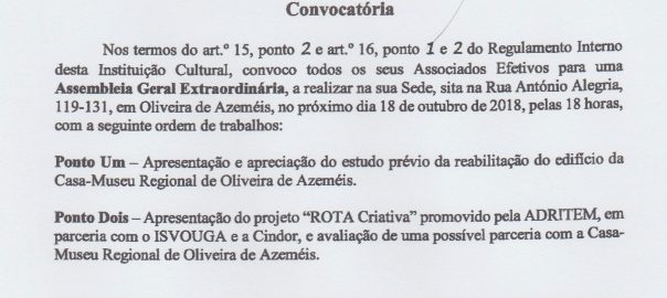 A Casa-Museu Regional de Oliveira de Azeméis informa que irá realizar-se uma Assembleia Geral Extraordinária, no próximo dia 18 de outubro de 2018, às 18h, nas suas instalações.