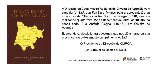 Informamos que no próximo dia 22 de dezembro de 2021, às 18.30h, irá realizar-se o lançamento/apresentação do nº10 da revista “Terras entre Douro e Vouga” na Casa-Museu Regional de Oliveira de Azeméis.Read More…