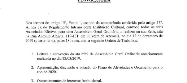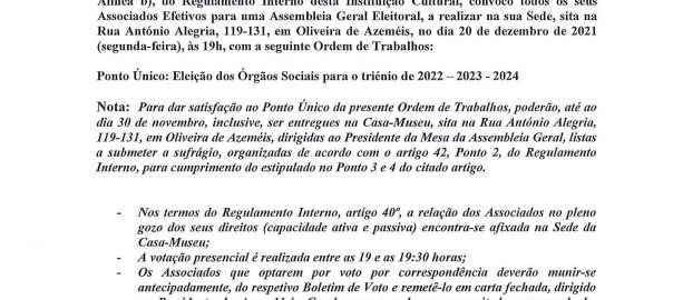 A Direção da Casa-Museu Regional de Oliveira de Azeméis informa que vai realizar-se, nas nossas instalações, no próximo dia 20 de dezembro de 2021, às 19h, uma Assembleia Geral Eleitoral, que teráRead More…